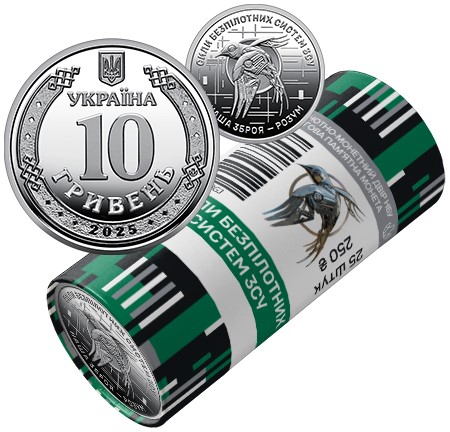 Опис: Ролик обігових пам’ятних монет присвячено окремому роду сил, який відіграє ключову роль у сучасних бойових діях. Сили безпілотних систем Збройних Сил України (далі – ЗСУ) системно застосовують повітряні, морські, а також наземні безпілотні та роботизовані системи для реалізації широкого спектра бойових завдань в умовах асиметричного протистояння. Ця монета вшановує внесок особового складу Сил безпілотних систем ЗСУ у захист територіальної цілісності України, символізуючи інноваційність, технологічну перевагу та інтелект українського війська. На сувенірному папері, у який запаковано кожний ролик, розміщено написи: БАНКНОТНО-МОНЕТНИЙ ДВІР НБУ, ОБІГОВА ПАМ’ЯТНА МОНЕТА, СИЛИ БЕЗПІЛОТНИХ СИСТЕМ ЗСУ, 25 ШТУК, номінал 250 та графічний знак гривні; логотип Банкнотно-монетного двору Національного банку України, зображення емблеми Сил безпілотних систем ЗСУ на тлі стилізованих повітряних потоків.