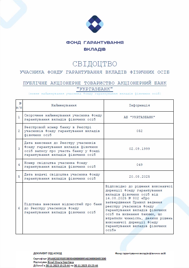 АБ «УКРГАЗБАНК» є постійним учасником Фонду гарантування вкладів фізичних осіб з 02.09.1999 (свідоцтво учасника Фонду від 20.08.2025 р. № 049).