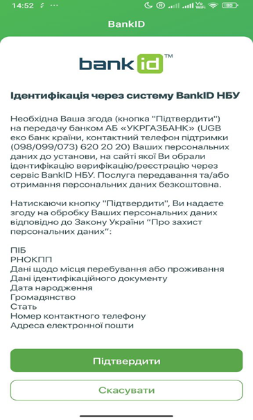На порталі надавачів послуг, які приєднані до BankID необхідно обрати ідентифікуватись/авторизуватись/ввійти за допомогою BankID. На сторінці BankID вибирає АБ «УКРГАЗБАНК» для авторизації через BankID. Клієнт натискає кнопку «підтвердити в мобільному додатку Банку». Клієнт перейшовши в мобільний додаток Банку, ідентифікується як клієнт Банку з використанням багатофакторної автентифікації при першому вході в мобільний додаток Банку, якщо клієнт вже заходив в мобільний додаток Банку - з використанням однофакторної аутентифікація (пароль або Face ID). На сторінці мобільного додатку Банку клієнт ознайомлюється з переліком даних, що передаються, з розміром плати за передавання його ідентифікаційних даних із використанням Сиcтеми BankID та надає згоду на передачу персональних даних та на таку оплату (у випадку, якщо таку плату має сплачувати клієнт) шляхом проставлення відповідної позначки у явному вигляді «Підтвердити». У разі успішного проходження автентифікації клієнт Банку автоматично переспрямовується на сторінку порталу послуг надавача послуг для продовження отримання послуги. Надавач послуг отримує персональні дані клієнта Банку в зашифрованому вигляді через Систему BankID.