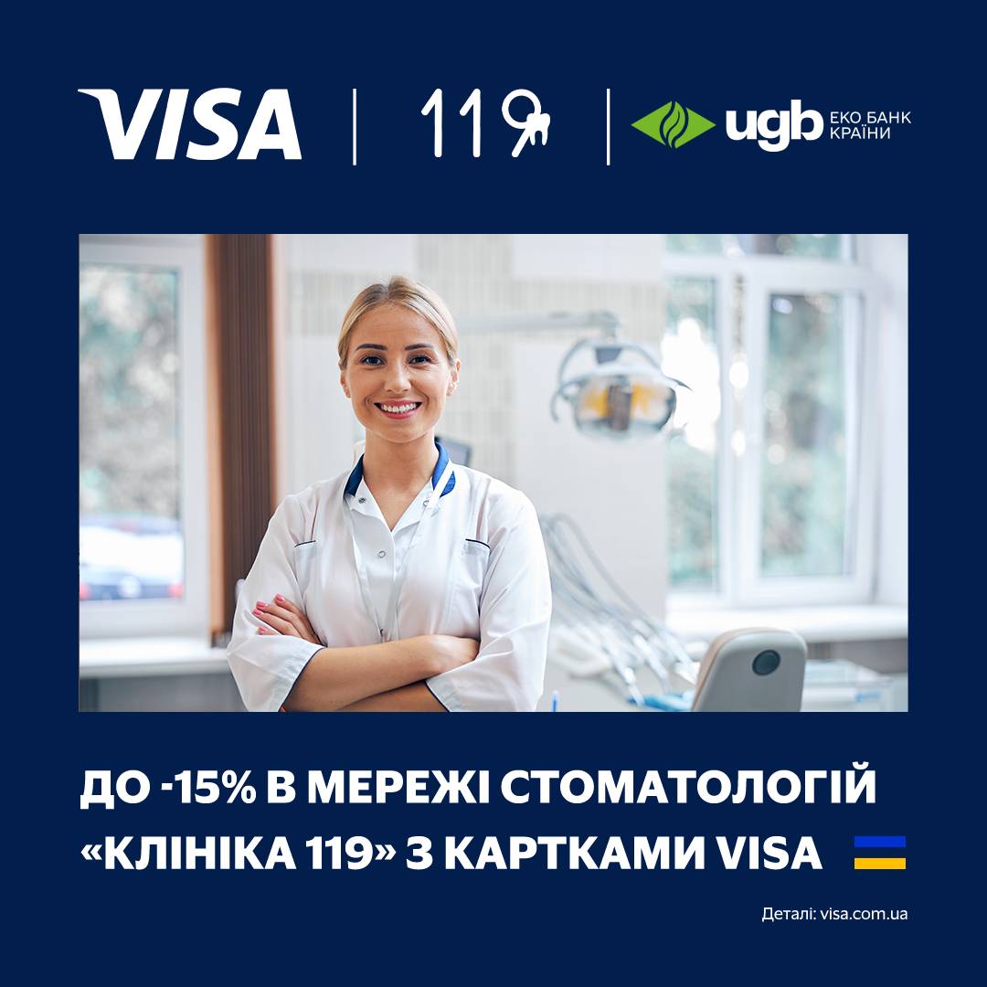 Подаруйте собі здорову усмішку, а також скористайтеся знижкою: -5% за умови оплати будь-якою карткою Visa та -15% з преміальними картками Visa Platinum, Visa Platinum Business, Visa Signature, Visa Signature Business, Visa Infinite. Зверніть увагу: щоб скористатися знижкою, вам потрібно повідомити працівників стоматології, що ви є держателем картки Visa.