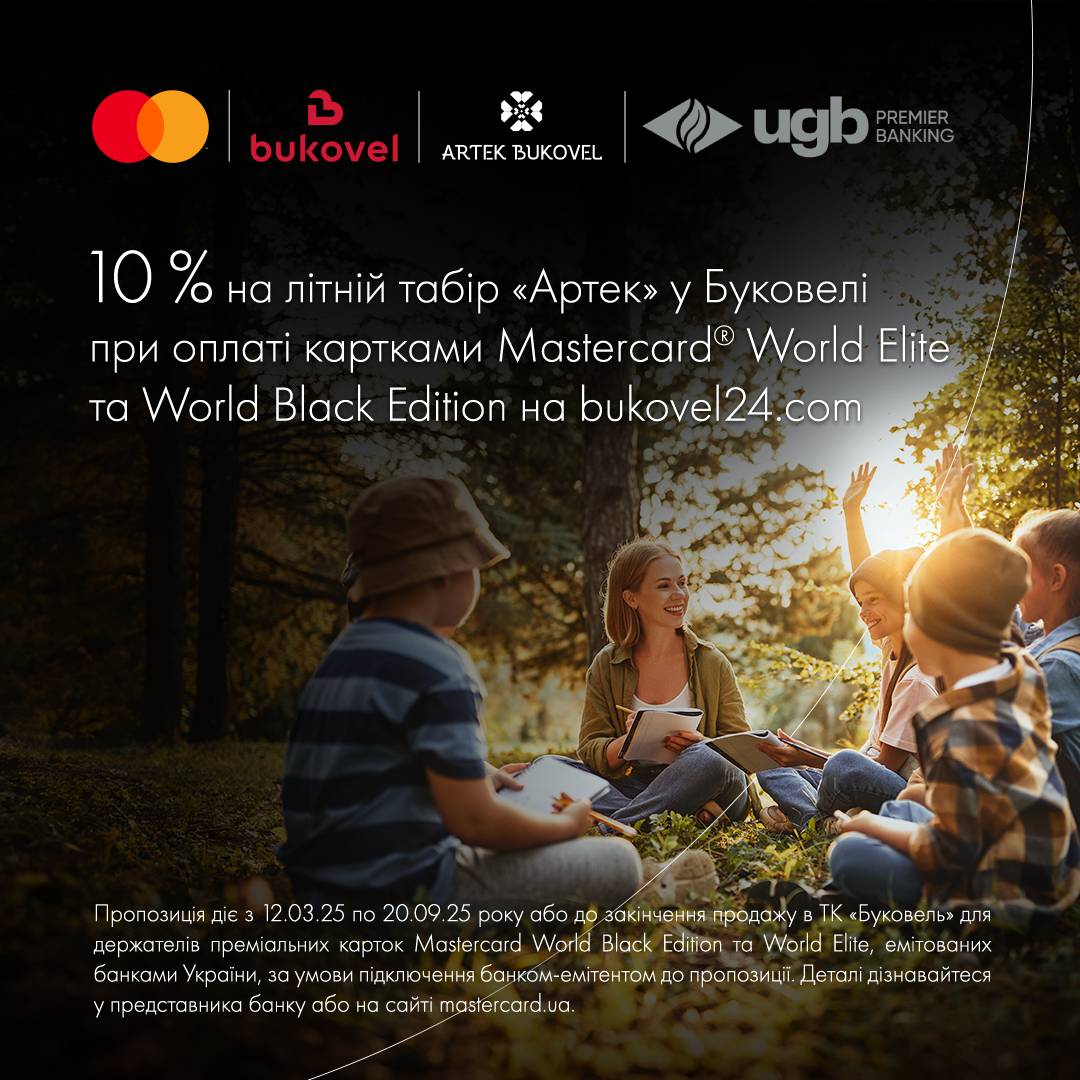 Яскраве літо для дітей, сповнене приємних переживань, натхнення та пригод разом з Mastercard. 10 % знижки на табір «Артек» у Буковелі при оплаті карткою Mastercard® World Elite від UGB на bukovel24.com.