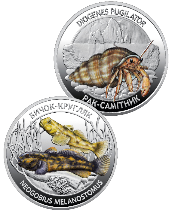 Опис: Набір із двох пам’ятних монет присвячений унікальним представникам морської фауни Чорного та Азовського морів – невід’ємній складовій природної спадщини України. Чорне та Азовське моря відіграють важливу роль у збереженні біорізноманіття регіону, підтриманні екологічної рівноваги та забезпеченні економічної стабільності держави. Серед багатьох мешканців цих водойм – рак-самітник (Diogenes pugilator) і бичок-кругляк (Neogobius melanostomus) – види, що слугують біоіндикаторами стану морського середовища та є важливими елементами морських екосистем. Цим набором з двох пам’ятних монет Національний банк України має на меті привернути увагу до проблеми збереження морів, нагадати про відповідальність людства за охорону природних ресурсів і підкреслити значення морської біоти у формуванні екосистеми України.