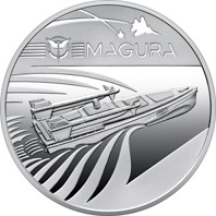На реверсі монети зображено стилізований безпілотний надводний апарат “Magura”, що стрімко рухається по хвилях, демонструючи динаміку й точність. У верхній частині композиції – сцена знищення винищувача Су-30 з елементами вогню та вибуху, що символізує ефективну протидію агресору на морі та в повітрі. Нижче розміщено емблему Головного управління розвідки Міністерства оборони України, що акцентує на ексклюзивному використанні цих морських дронів підрозділом Group 13, та напис MAGURA, виконаний у стилі логотипа виробника, що підкреслює автентичність, національну гордість та визнання досягнень українського оборонно-промислового комплексу.