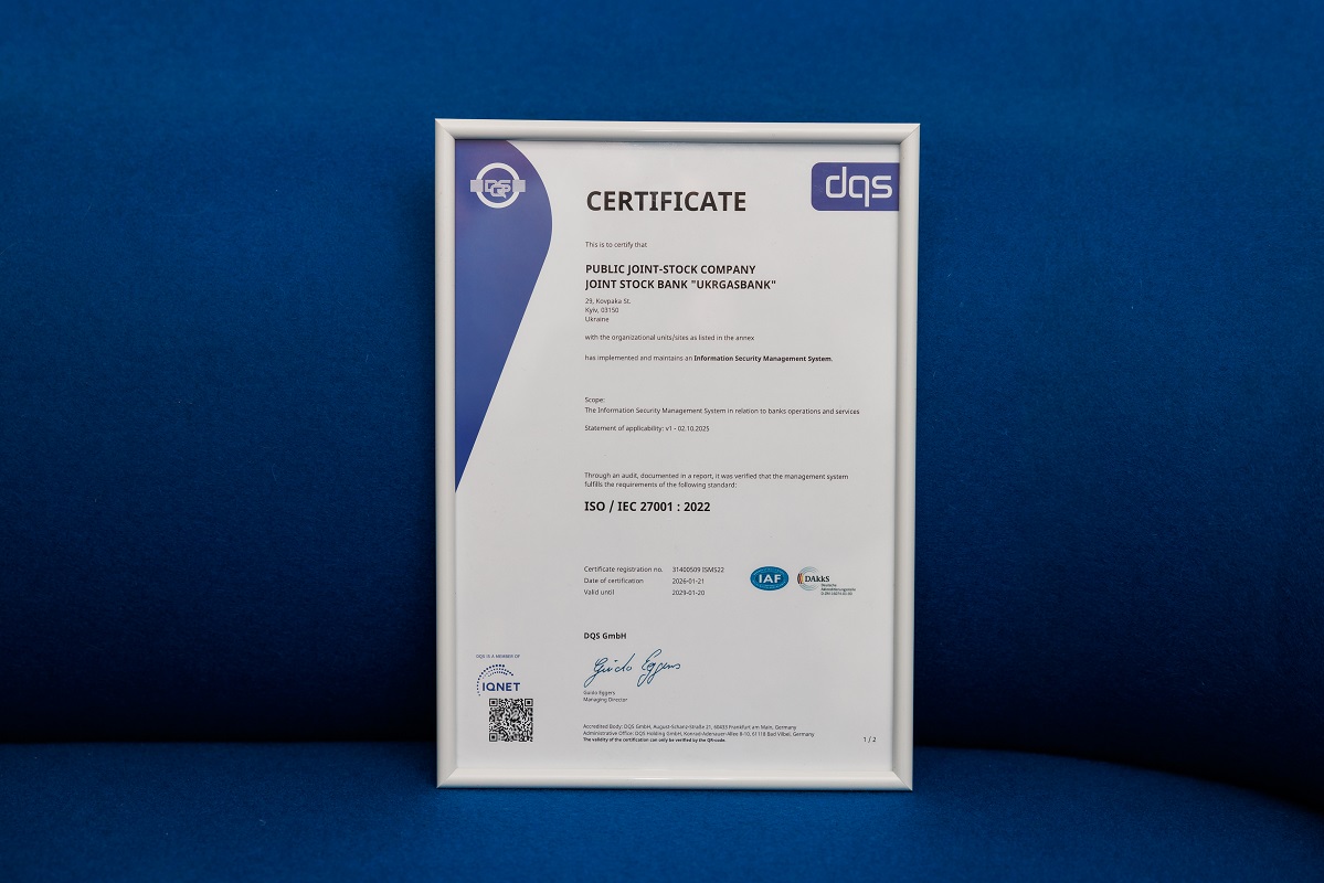 UGB (Укргазбанк) успішно пройшов незалежну сертифікацію системи управління інформаційною безпекою (СУІБ) та підтвердив її відповідність вимогам міжнародного стандарту ISO/IEC 27001:2022. Аудит було проведено міжнародною компанією DQS.
